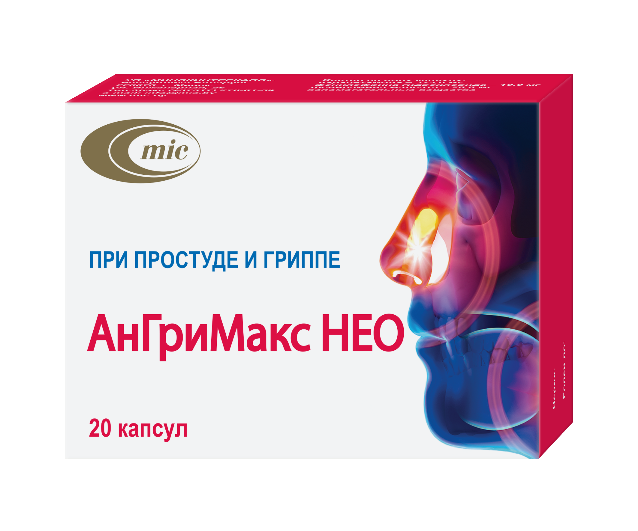 Парацетамола – 325 мг, фенилэфрина гидрохлорида – 10 мг, фенирамина малеата – 20 мг. В упаковке 20 капсул.