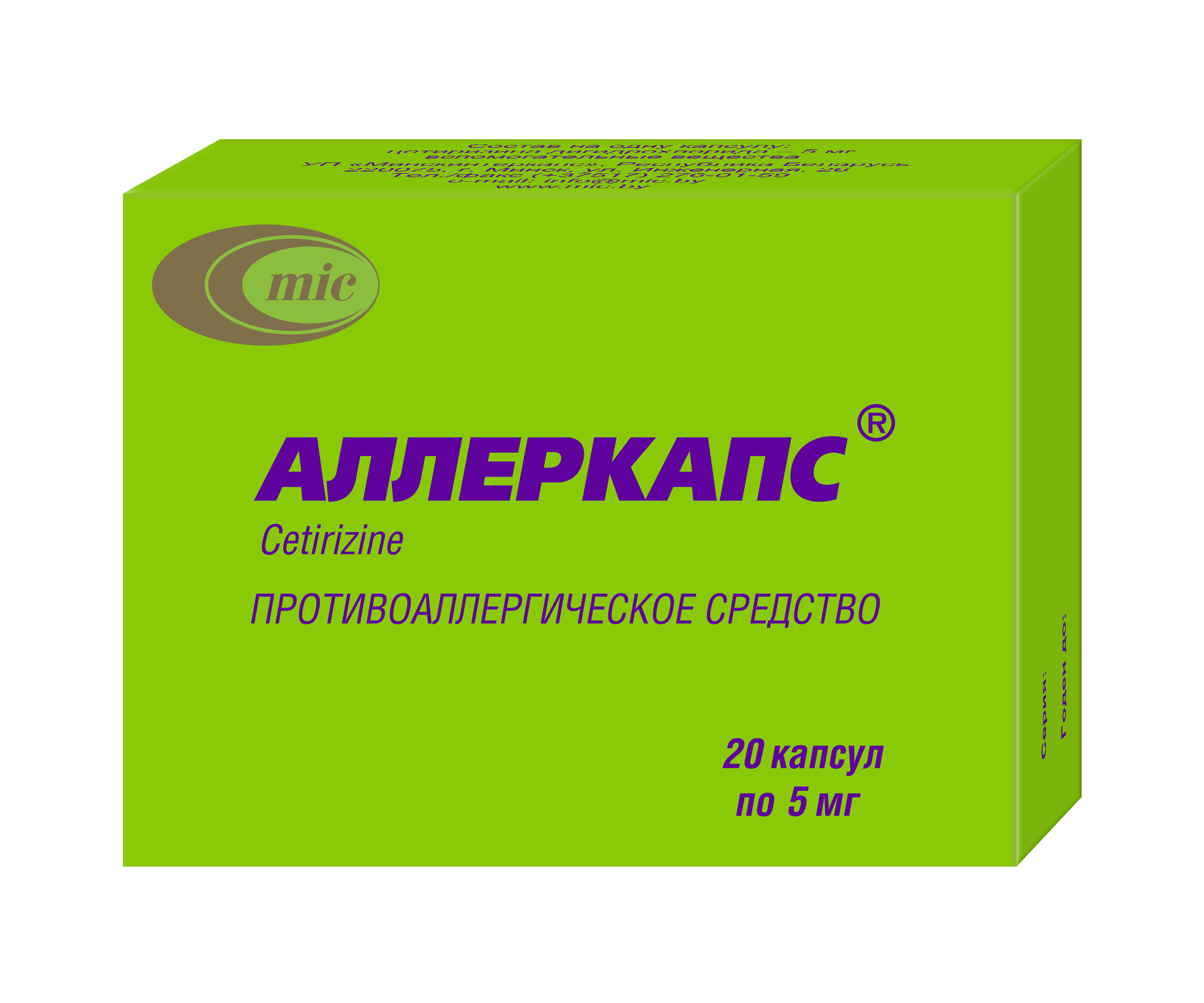 Цетиризина дигидрохлорида – 5 мг. В упаковке 20 капсул.